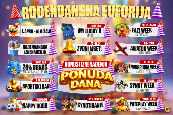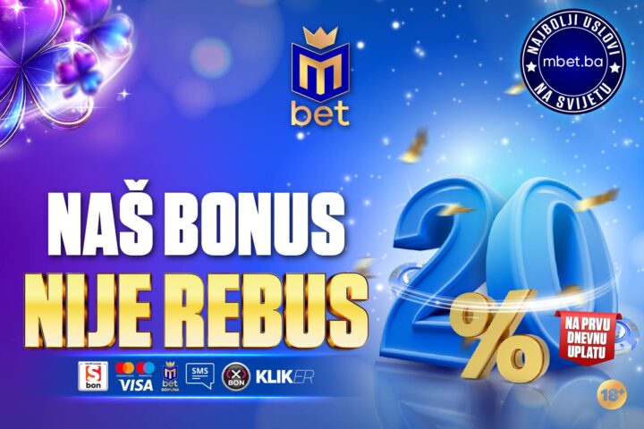 MBET PROMOCIJE Provajder sedmice: Igraj Endorphina igre, vraćamo 20% CASHBACKA Nove igre u ponudi na košarkaše – kutak za znalce i lovce na velike novce! Rođendanski mjesec prepun iznenađenja i promocija koje ne smiješ da propustiš! Naš bonus nije rebus: Častimo sa 20% bonusa na uplatu tokom rođendanskog mjeseca! Ne čekaj ništa! Odaberi srećne brojeve na My Lucky6 Instant, runda kreće odmah! Samo na Mbet korneru: Uzmi bonus na uplatu od 30% + 20 spinova Mbet je na EP media terminalima: Dopuni nalog, čeka te tiket ili besplatno spinovanje Dopuni nalog xBonom i Klikerom uz 0% provizije! Uz opciju CASHOUT ti si gazda svog tiketa! Bogovska dobrodošlica: Uzmi 3×5 minuta spinovanja na Gates of Olympus! Duplo profitiraj: Uzmi bonus 30% svaki dan na Mbet korneru, te zgrabi dodatnih 5 KM! Dopuni nalog uz 0% posto provizije putem svih kanala uplate! Svaki tiket kod nas je DOBITAN! Pao si jedan par? Kod nas je i stativa pogodak! Isplata dobitka u trenu: Uz Mbet cash code isplati se 24/7 Cash to go – uzmi svoj novac ODMAH KAZINO TURNIRI Zvoni Mbet: Zaigraj Bell Link igre jer dijelimo 2.000 spinova, a tu je i Jackpot od 68.000 KM! Synotiraj vikendom! U igri je 2.000 spinova! Srijedom zaokružuj brojeve i bori se za 500 KM freebeta! OSTALE PROMOCIJE Preuzmi Mbet aplikaciju za ugođaj bez granica Dajemo ti do 350% bonusa na broj parova Pojačaj dobitak moćnom bonus kvotom Uz MOVE aplikaciju ne propusti ni sekund sportskog sadržaja BUDI U TOKU! Zaprati nas na društvenim mrežama Zabava, ne zarada: Mbet u službi odgovornog klađenja PODRŠKA 08 - 22h Telefon: 066 666 222 E-mail: [email protected] O nama INFORMACIJE Opšta pravila Odgovorno klađenje Uslovi korištenja Politika privatnosti Politika kolačića Politička aktivnost Opis igara